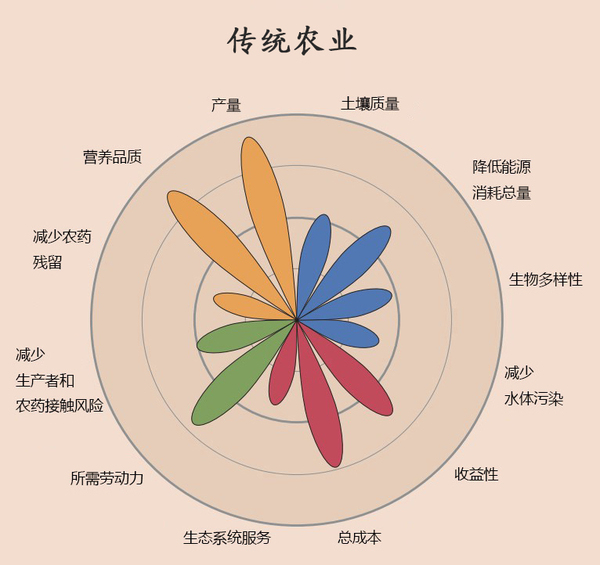 四種花瓣的顏色代表了定義“可持續”的四個維度,生產量(橙色),環境(藍色),經濟效益(紅色)和社會福祉(綠色)。